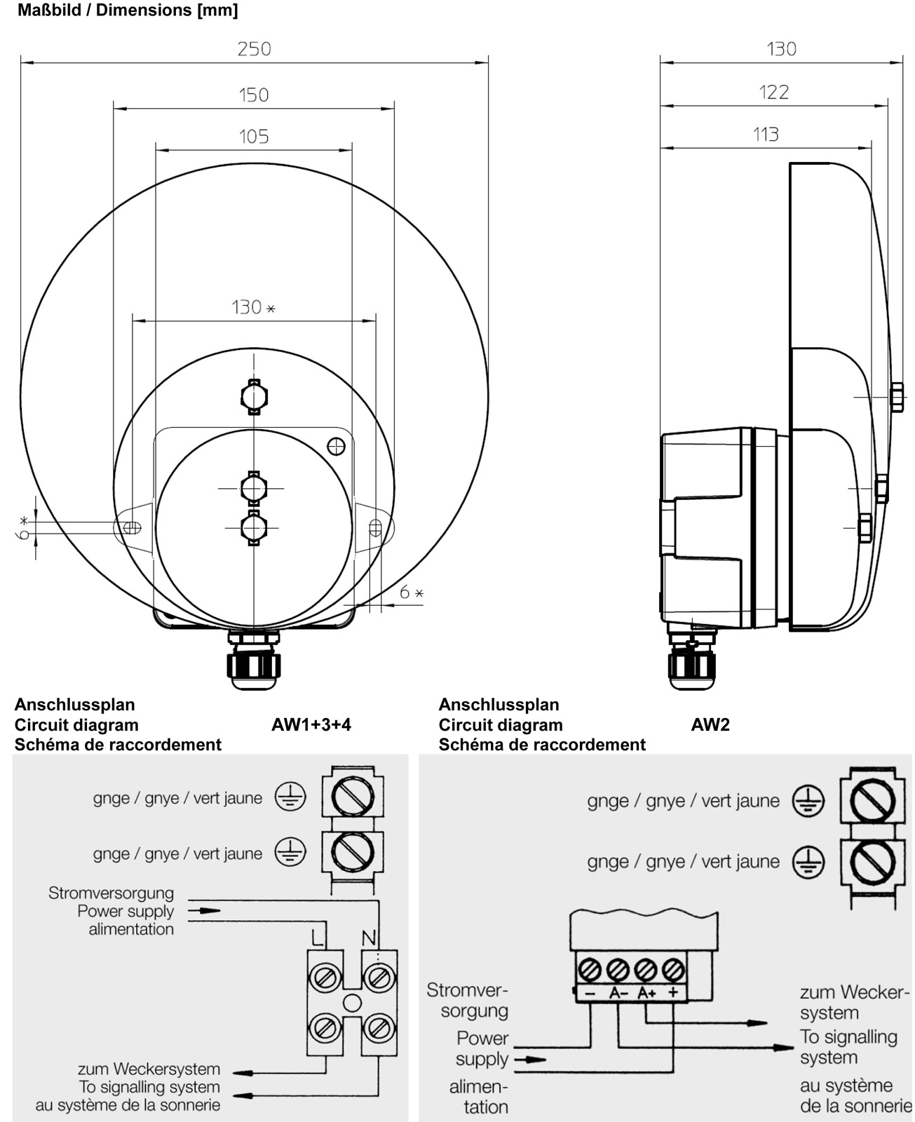 The Single-stroke Bells AW 3 and AW 4 are each equipped with an electromagnet system that drives the striker against the bell dome only once per current-on transition. The maximum permissible duty cycle is 5 min.